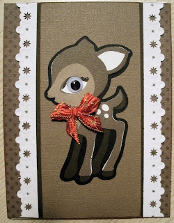 The deer is from Cindy Lou...I added a google eye and pretty bow. For the card I layered Bo Bunny Cafe with white and scraps of brown from cutting the deer. The white was cut with a Martha Stewart Snowflake border punch. Simple, but cute.